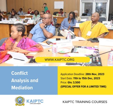 The KAIPTC has introduced three (3) fee-paying courses to meet the growing demand for peace and security education. The courses are Artificial Intelligence in Peacebuilding; Leadership and Management in Security Organisations; and Conflict Analysis and Mediation (CAM)